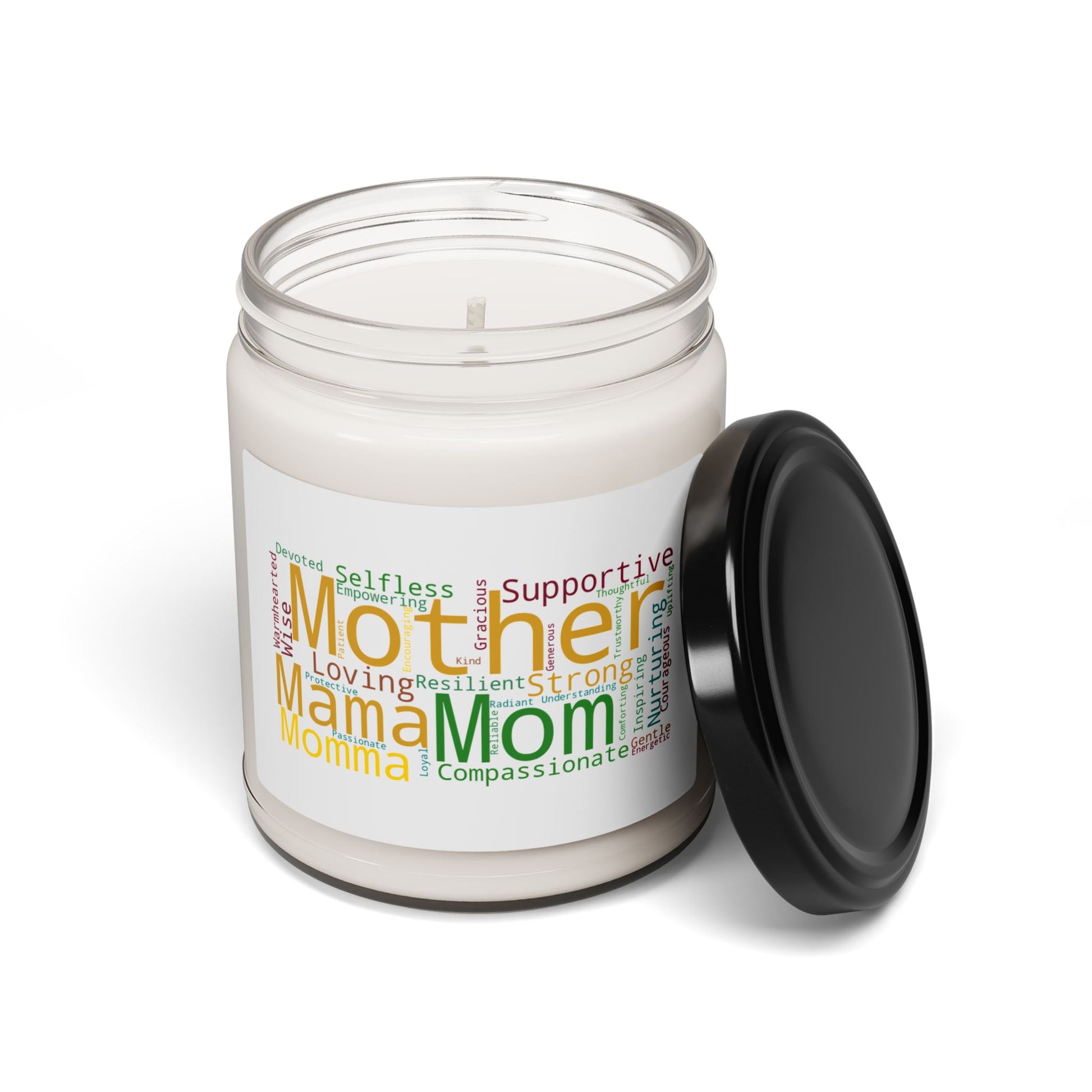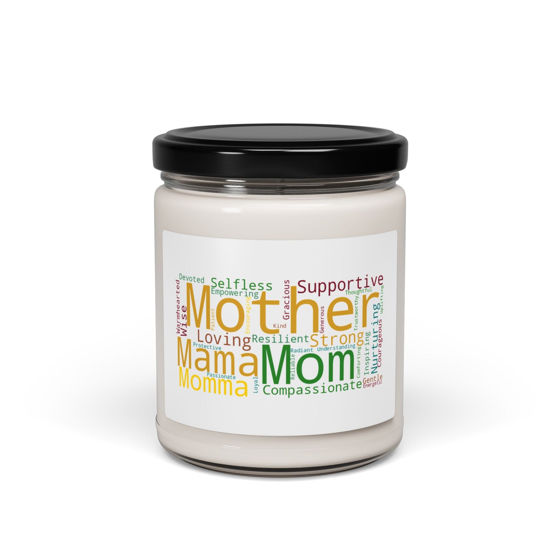 The label features a touching "word cloud" design filled with uplifting adjectives that capture the essence of motherhood - Devoted, Selfless, Loving, Supportive, Resilient, Wise, Gracious, Nurturing, Compassionate, Strong, and more. Whether she goes by Mom, Mama, Momma, or Mother, this candle is a warm reminder of her irreplaceable role in your life.