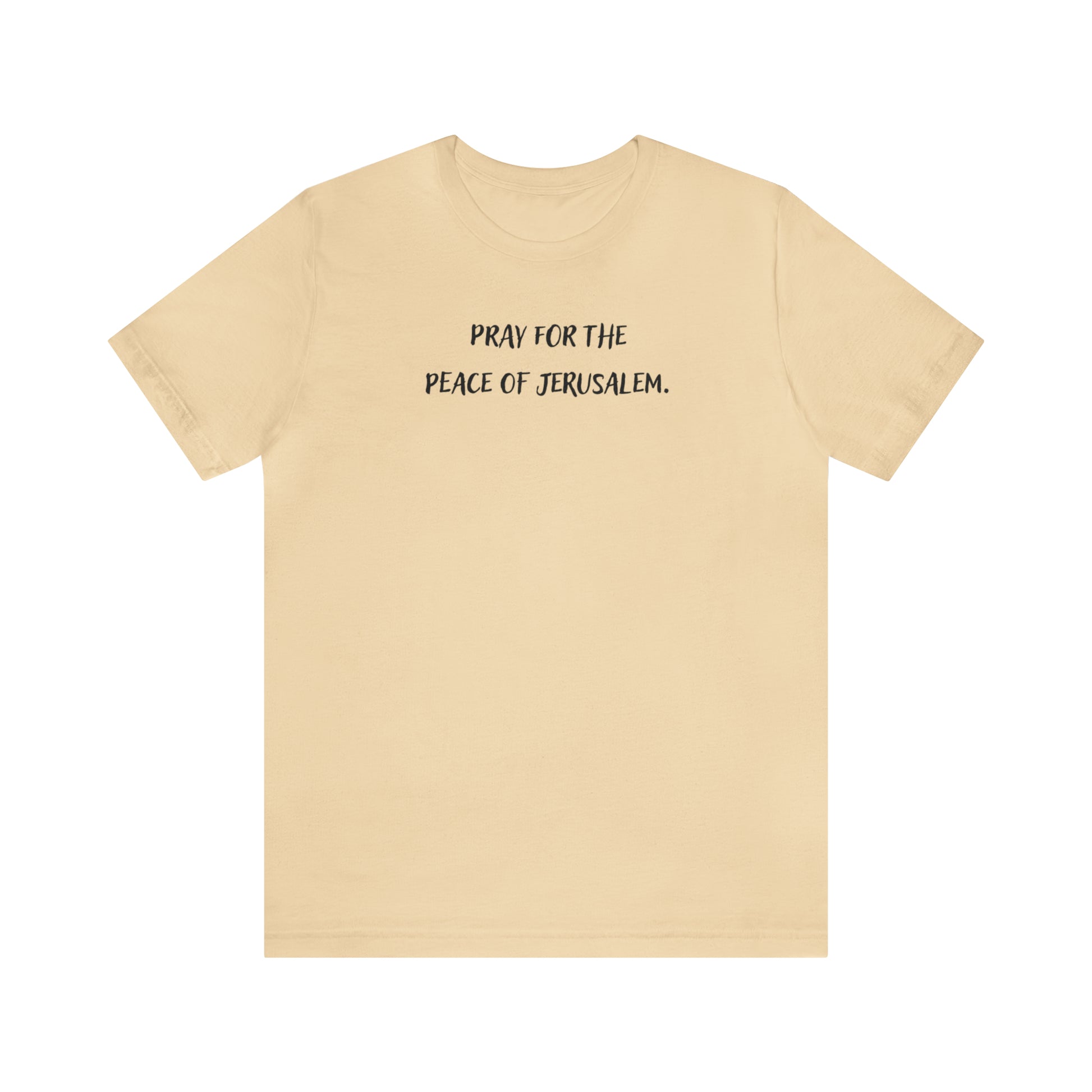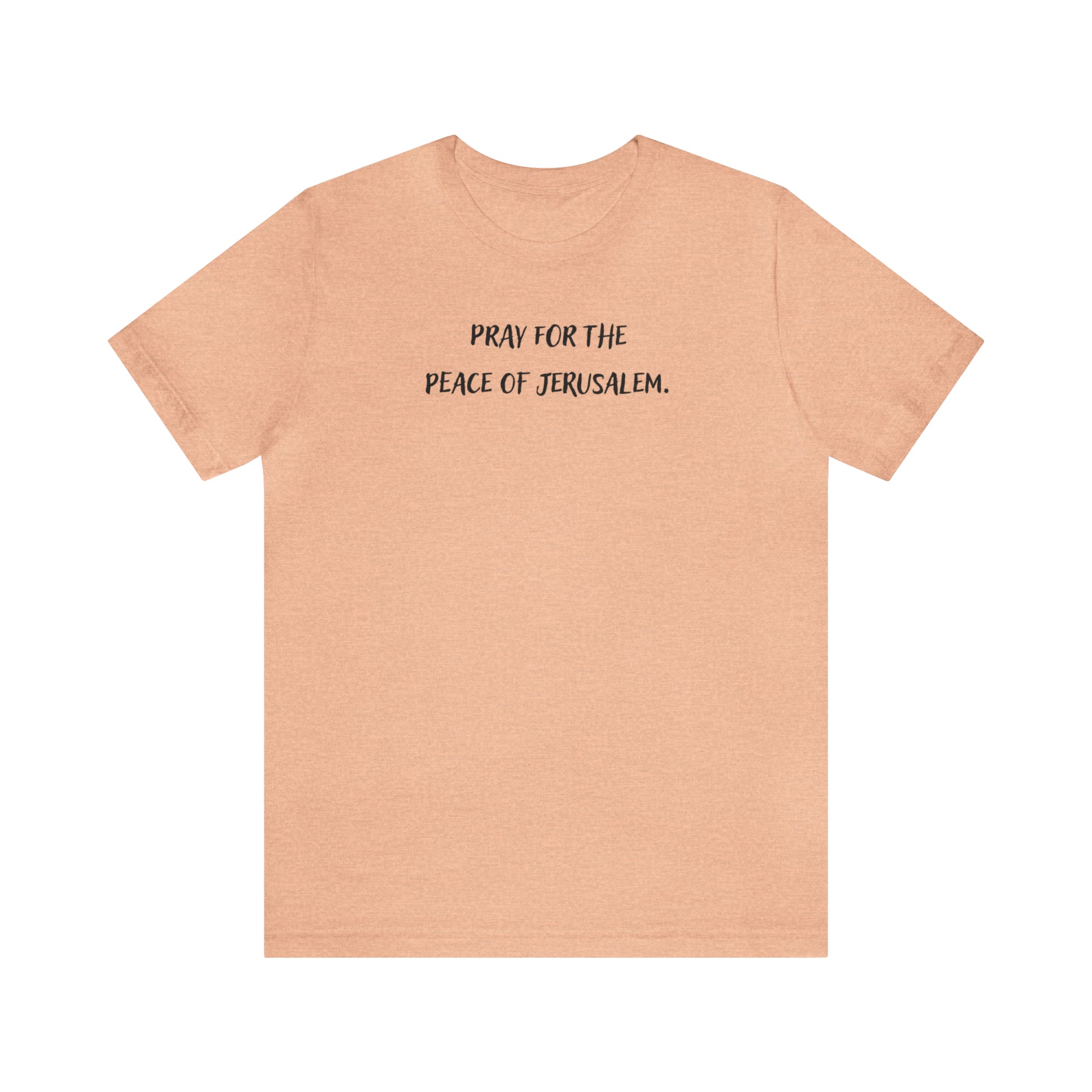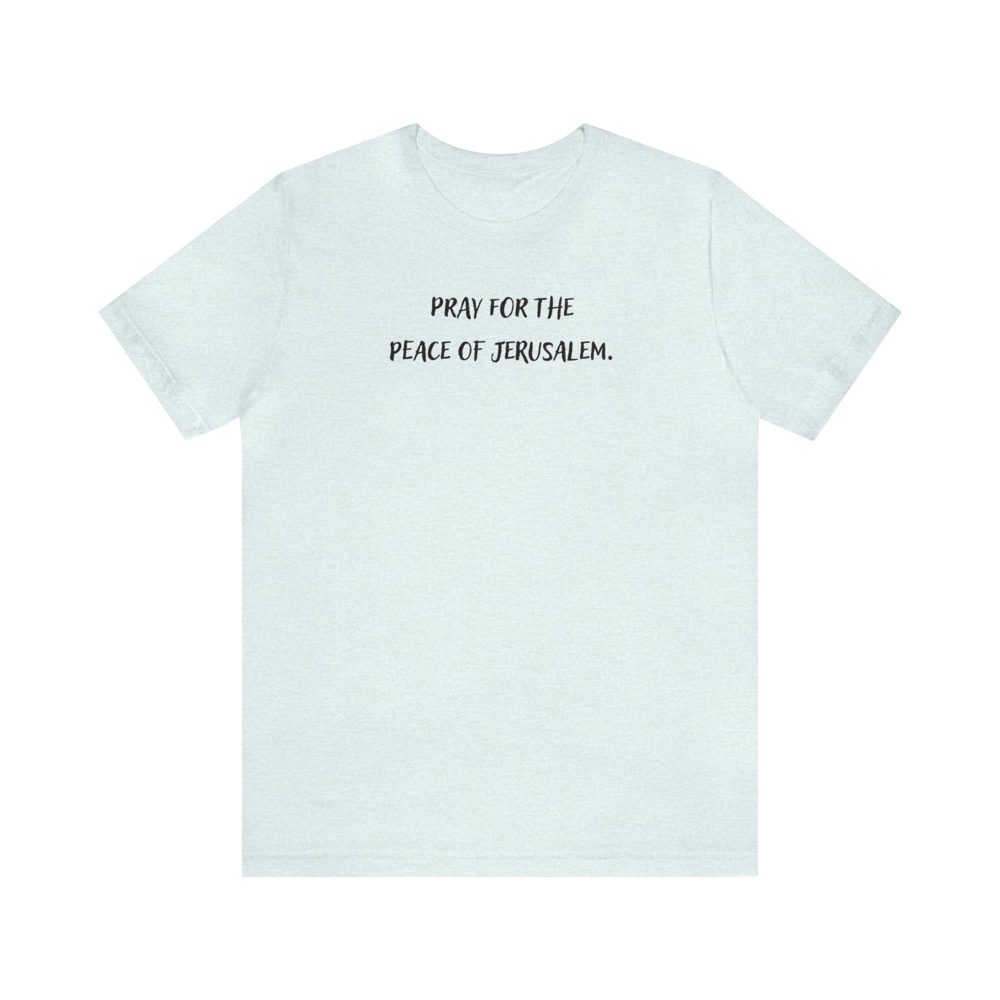 Pray for the peace of Jerusalem. This classic unisex jersey short sleeve tee fits like a well-loved favorite. Soft cotton and quality print make users fall in love with it over and over again. These t-shirts have-ribbed knit collars to bolster shaping. The shoulders are tapered for a better fit over time. Dual side seams hold the garment's shape for longer.